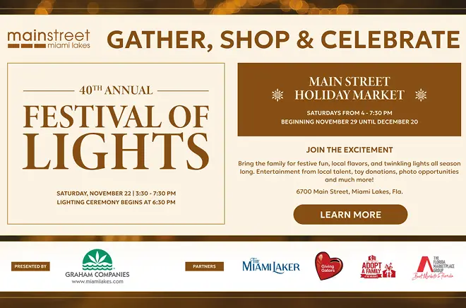 Get ready to celebrate the holiday season on Saturday, November 23, 2024! The Graham Companies and Main Street Merchants invite you to join in lighting up Downtown Miami Lakes and the iconic Main Street during the 39th Annual Main Street Festival of Lights, a treasured community tradition.