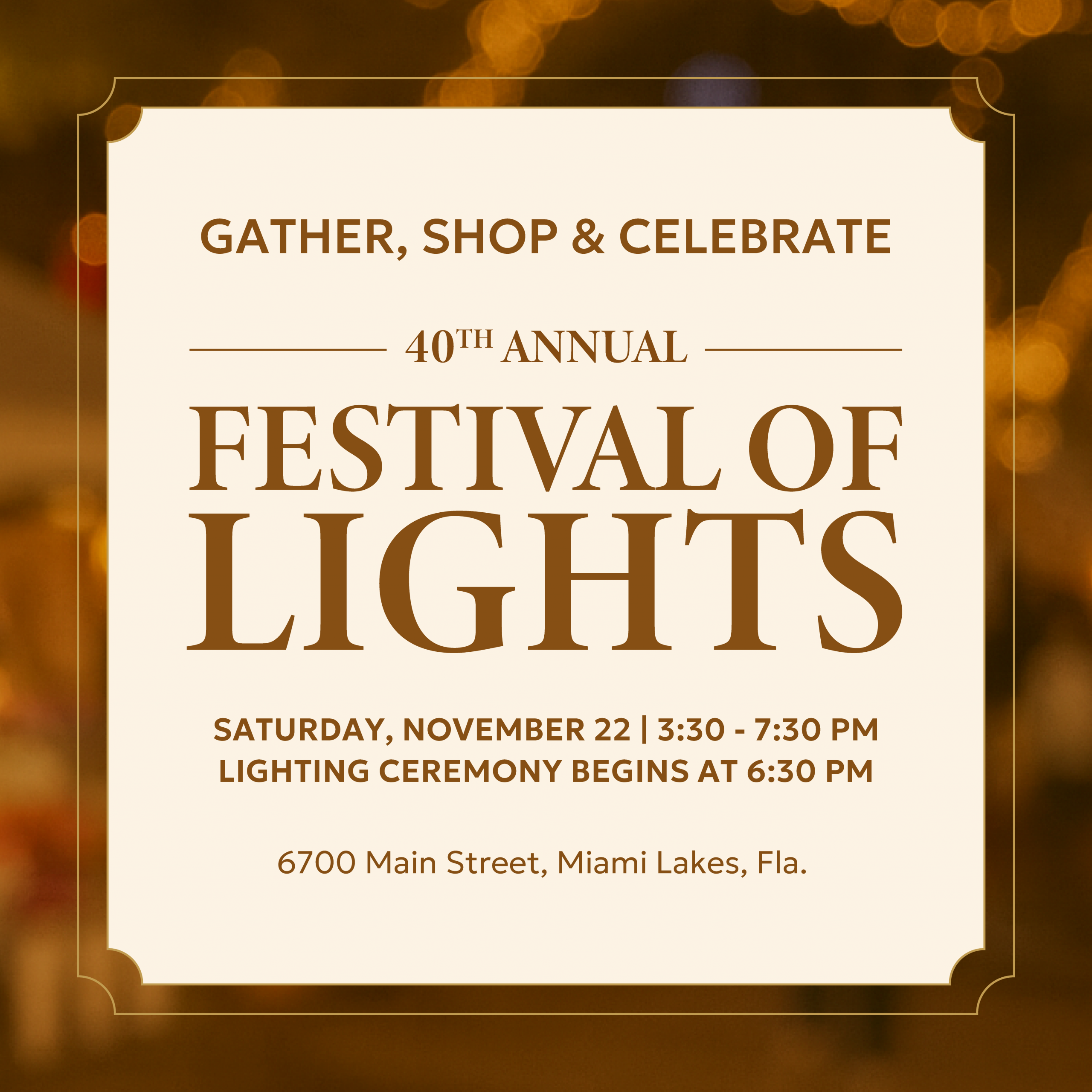 GATHER, SHOP & CELEBRATE the magic of the season with family and friends at the 40th Annual Festival of Lights, a beloved tradition on Main Street Miami Lakes. Experience the enchanting transformation of our streets into a winter wonderland, surrounded by a diverse array of restaurants, shops, and entertainment that make this event unforgettable.
