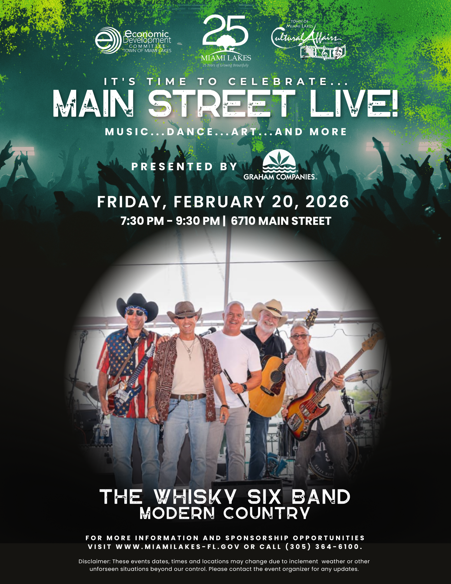 It’s time to celebrate … Main Street Live! Come out to the heart of Main Street Miami Lakes for a fun filled and energizing evening with modern country music from The Whisky Six Band.